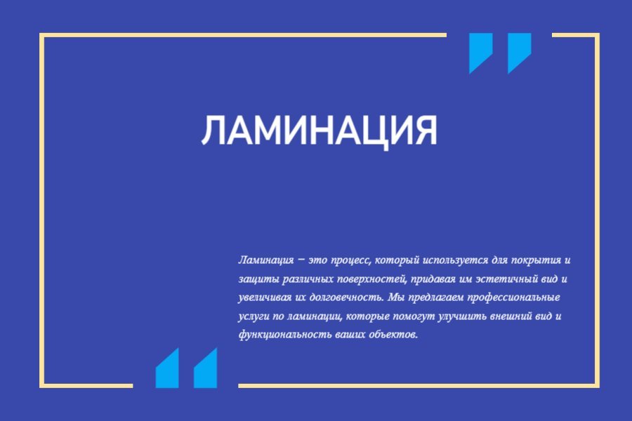 - Ламинация: Наши профессиональные мастера проведут процесс ламинации с высокой точностью и аккуратностью, соблюдая все технологические нормы и требования. Мы гарантируем качественное выполнение работы и внимание к деталям.